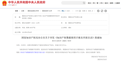 国家知识产权局关于印发《知识产权数据使用手册及开放目录》的通知