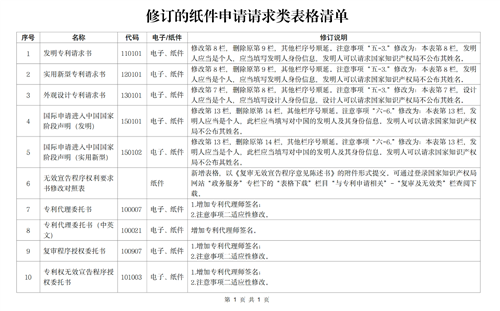 此次修订内容包括以纸件形式办理专利业务使用的请求类表格10份,包含发明专利请求书、国际申请进入中国国家阶段声明、专利代理委托书、复审程序授权委托书等.
